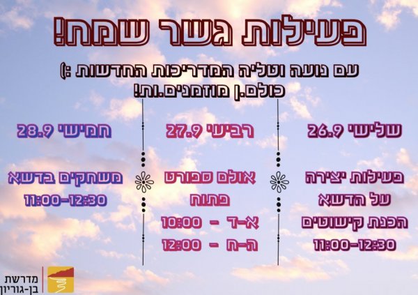 נשמח אם תכתבו לנו באיזה נושאים תרצו להתמקד על מנת שנוכל להעבירם מראש.