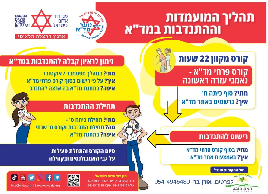 תוכנית פרחי מד"א המיועדת למסיימי ח' לטובת הכנסתם לקבוצת נוער מד"א ושילובם בפעילות הקהילתית במועצה. יש להירשם בלינק. לשאלות ופרטים: רכז תוכנית נוער מד"א ברמת הנגב: אורן בר 054-4946480