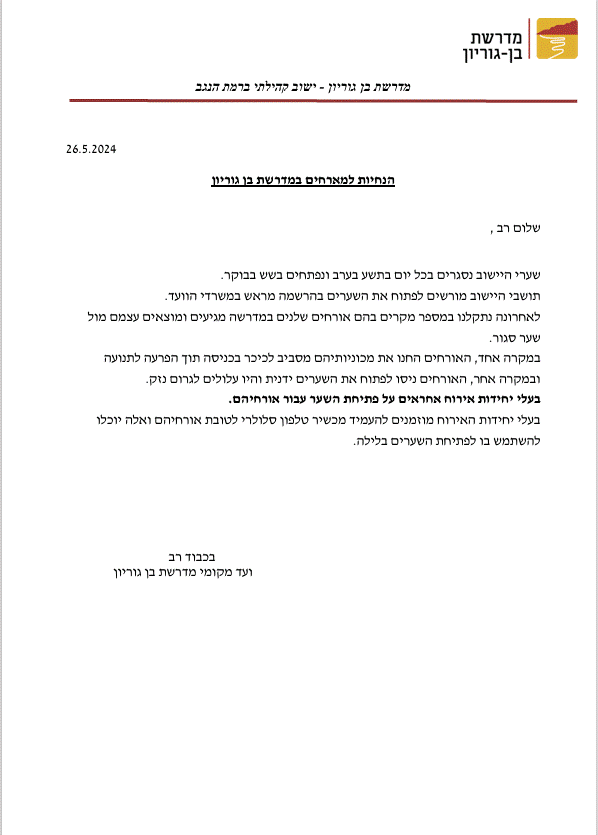 הנחיות לבעלי יחידות האירוח במדרשה - פתיחת שערי המדרשה