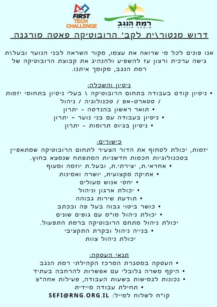 דרוש מנטור/ית לקב' הרובוטיקה פאטה מורגנה