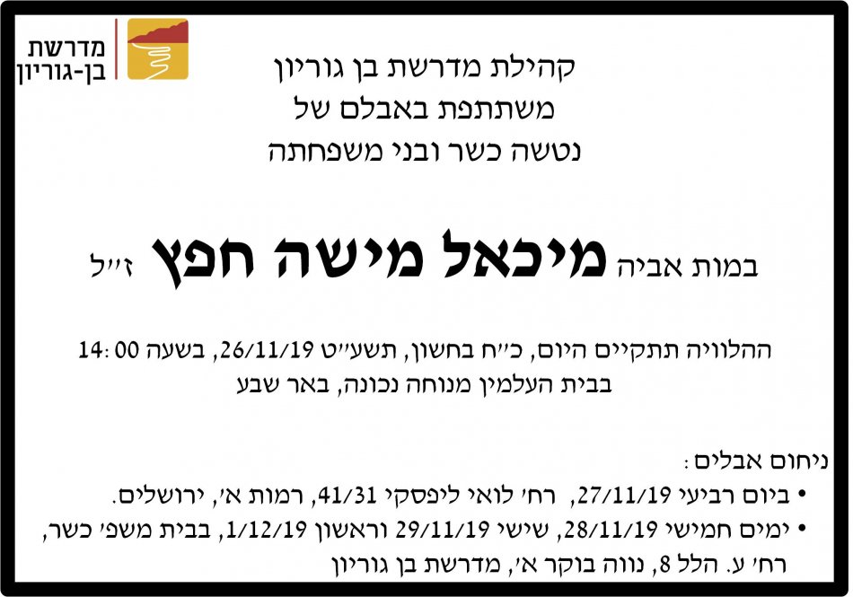 קהילת מדרשת בן גוריון משתתפת באבלם של נטשה כשר ובני משפחתה, במות אביה מיכאל מישה חפץ ז"ל
