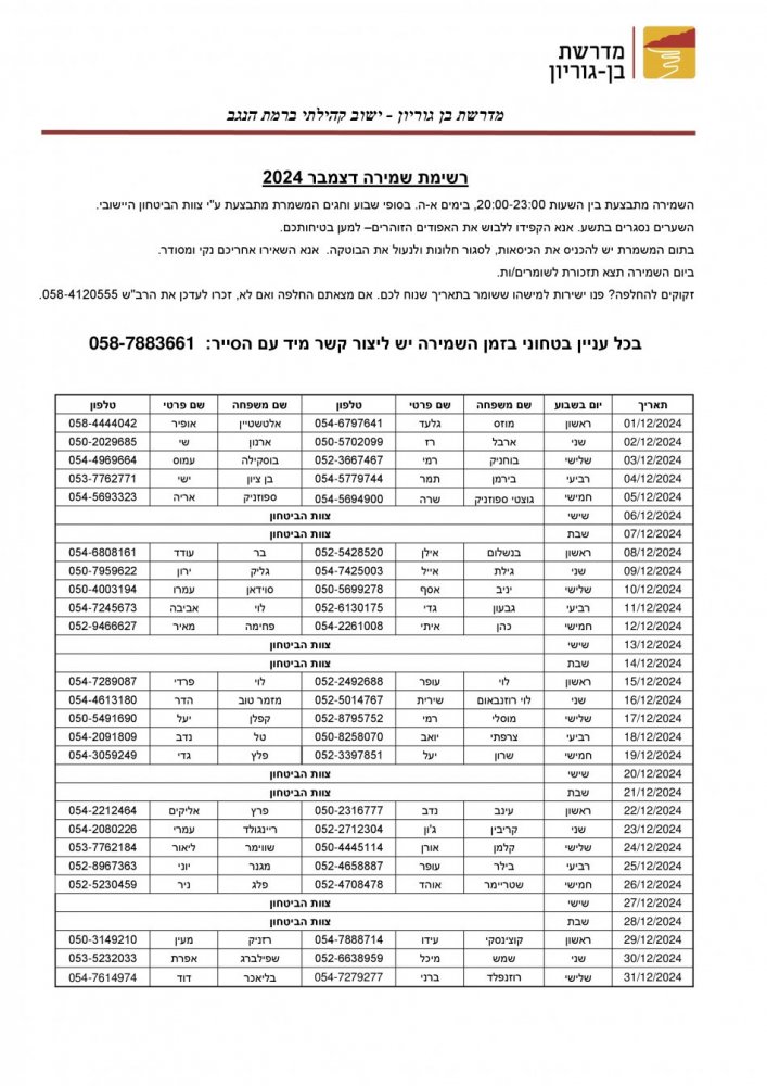 שלום רב, מצ"ב רשימת השמירה לחודש דצמבר. השמירה מתבצעת בהתנדבות, אחת לשלושה חדשים לערך, בימים א-ה בין השעות שמונה לאחת עשרה בערב.