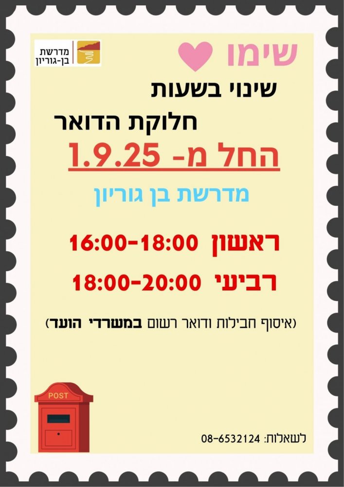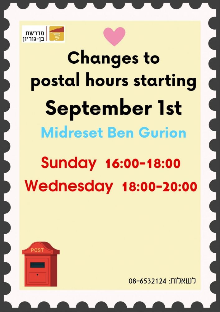 בשל בקשות רבות לפתוח את הדואר בשעות מאוחרות יותר ולרווח בין ימי הפתיחה - ריווחנו בין הימים ושינינו את שעות הפתיחה: