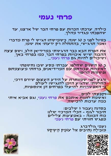 נעמי גולדברג, מורה ותיקה לזן שיאצו, מגיעה אלינו לדרום להעביר סדנה ייחודית על "פרחי נעמי".